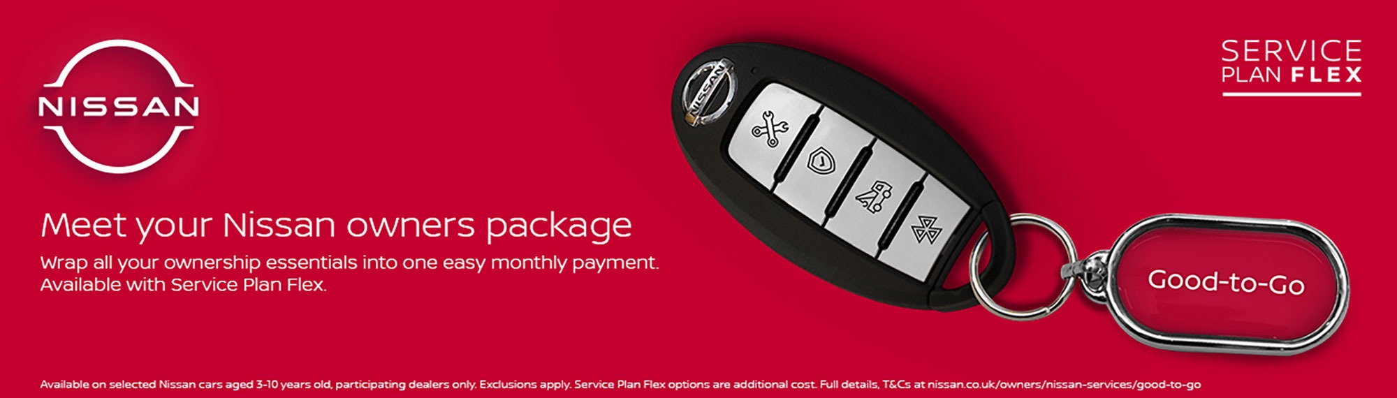 Nissan Good-to-Go package is available on all Nissan MICRA, NOTE, PULSAR, JUKE, QASHQAI, X-TRAIL, and LEAF models that are 3-10 years old from 1st registration and with less than 100,000 miles on the odometer at the commencement date (370Z, GT-R, Pathfinder, Light Commercial Vehicles and Nissan models that are not European specification are specifically excluded). Note for all X-TRAIL models a monthly supplement of £10 or annual charge of £120 is applied to the package. To qualify for the Nissan Good-to Go package the vehicle must: a) have an existing Nissan manufacturer’s warranty which expires within the next 30 days; or b) have an existing warranty administered by Nissan Extended Warranty Administration which expires within the next 30 days; or c) have completed a Nissan vehicle Good-to- Go comprehensive check including any remedial work prior to commencement date; or d) have completed a Fixed Price Service at a Nissan Dealer. Nissan Good-to-Go package comprises: 1 annual service (which cannot be taken until after 6 months from commencement date of the package), 12 months Nissan Roadside Assistance, 12 months extended warranty from package commencement date and an MOT Test carried out at a participating Nissan Dealer (note for Northern Ireland this is replaced with a pre-MOT check at a participating Nissan Dealer). Minor servicing includes oil, oil filter, sump plug washer, screen-wash, premium pollen filter only. Major servicing includes oil, oil filter, sump plug washer, screen-wash, premium pollen filter, brake fluid, air filter, fuel filter (diesel only) only. Oil, oil filter and sump plug washer are not included as part of an EV minor service. Servicing must be completed by a franchised Nissan Dealer at the intervals specified by Nissan. For full information on Nissan’s Customer Service Promise, click here. For full Roadside Assistance terms please refer to https://www.nissan.co.uk/ownership/nissan-services/nissan-car-assistance/roadside-assistance.html . Nissan Good-to-Go package is administered by Car Care Plan T/A Nissan Warranty /Service Plan Administration. Nissan Good-to-Go package is available at participating mainland United Kingdom Nissan dealers only. All prices are correct at time of publication and are subject to changes at any time without prior notification. Nissan Motor GB reserves the right to update, change, add, amend or withdraw the offer without prior notice. ^ Saving amount based on cost of Service, Comprehensive Warranty, MOT and 12 month equivalent RAC cover, when purchased separately. * Key Fob and Wiper Blades cover £4 per month; Brakes cover £12 per month. Speak to your dealer for more information.